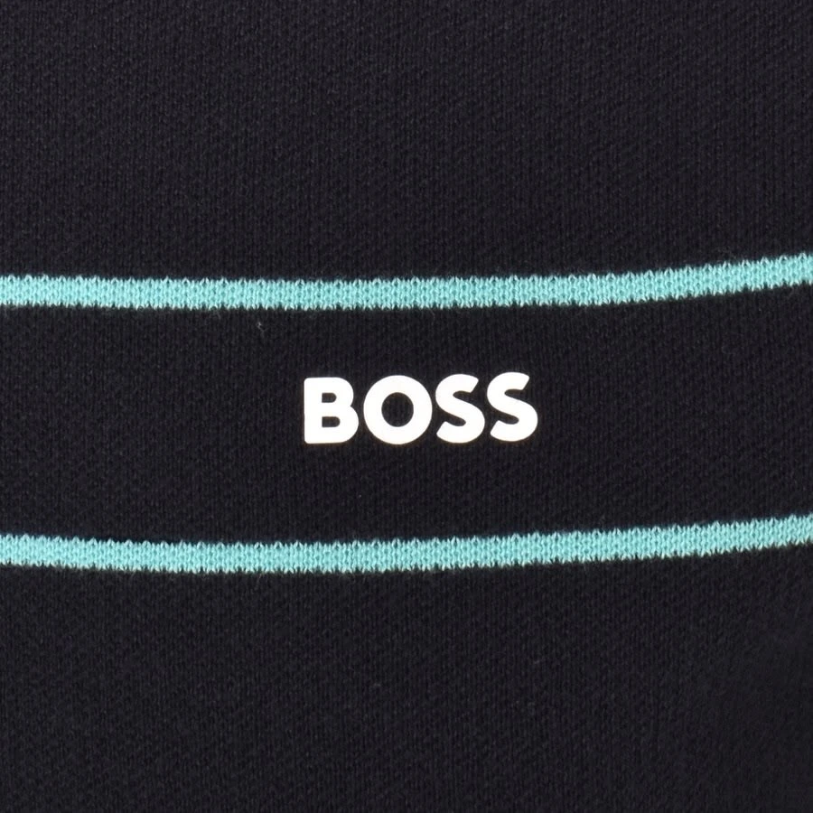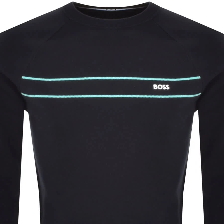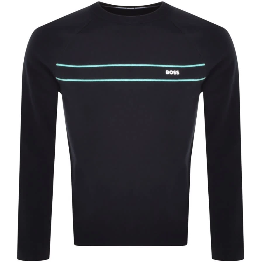 BOSS Righam Knit Jumper In Navy. A ribbed knit crew neck with ribbed knit cuffs on the long sleeves and a ribbed knit waistband. A two striped woven design features across the chest in light blue with the small signature BOSS rubberised logo printed on the left of the chest in white. Top stitching in navy. 80% Cotton And 20% Wool.