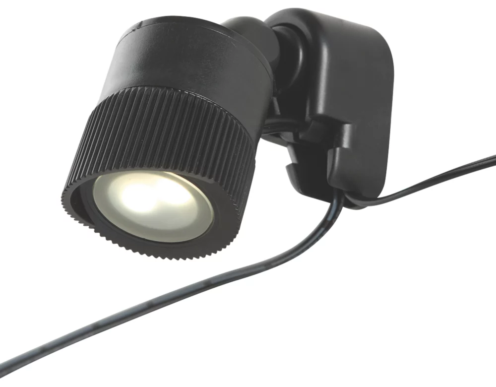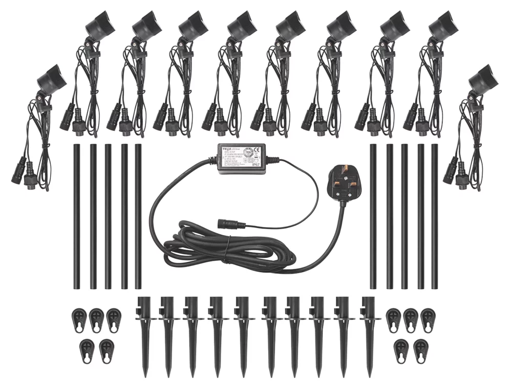 10 light LED spike kit in textured black finish that offers a stylish lighting solution to any outdoor area. Can also be wall-mounted. 1.5m cable length from head to head. Supplied with 5m extension cable.
