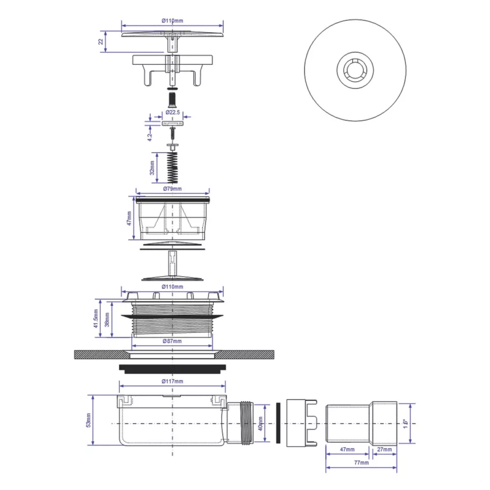 Spring-loaded non-return valve with 1½” solvent weld outlet. Valve reseals when the discharge ceases to prohibit entry of foul air. Can easily be removed for cleaning the trap. Overall height only 53mm, making this trap particularly suitable where floor depth is restricted.