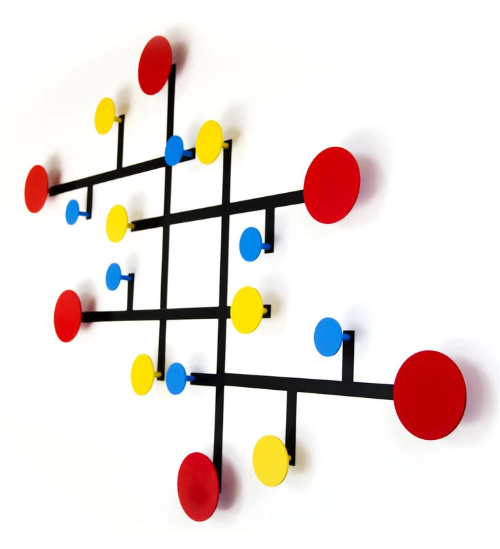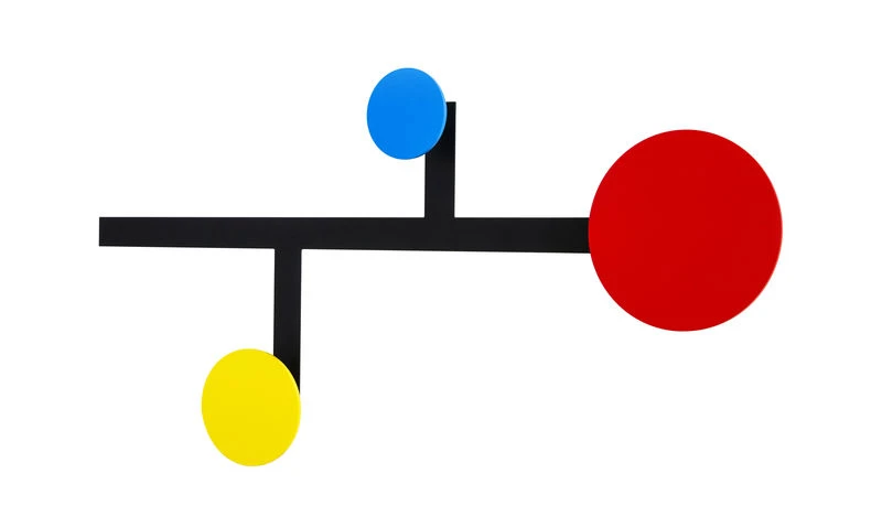 Piet consists of a black steel band that holds 3 color discs. Made of lacquered sheet metal, these discs form an original hook to hang your bags, jackets and coats. Piet can be installed alone, as a minimal and graphic piece or be associated with other units to form a large composition with a remarkable modernist aesthetic! Available in set of 3.