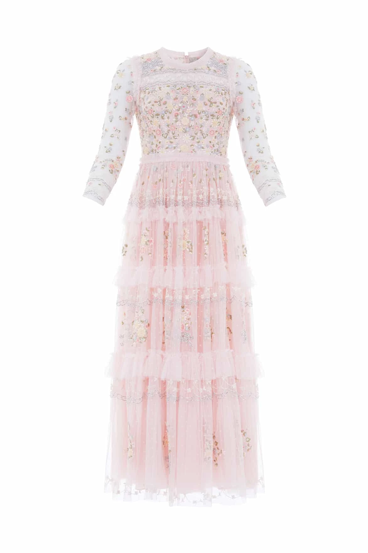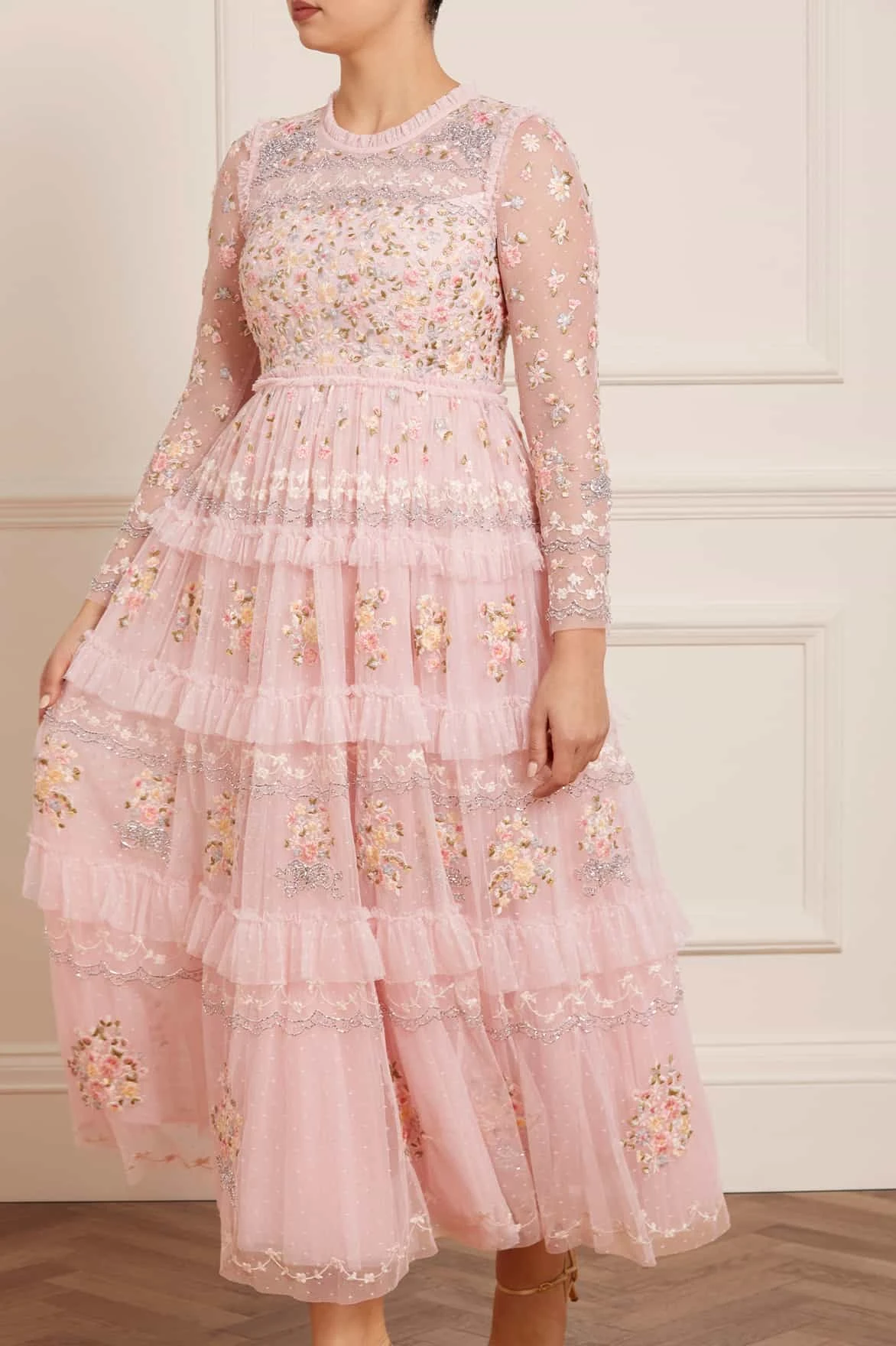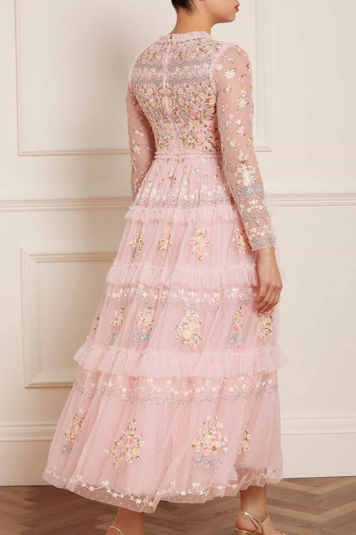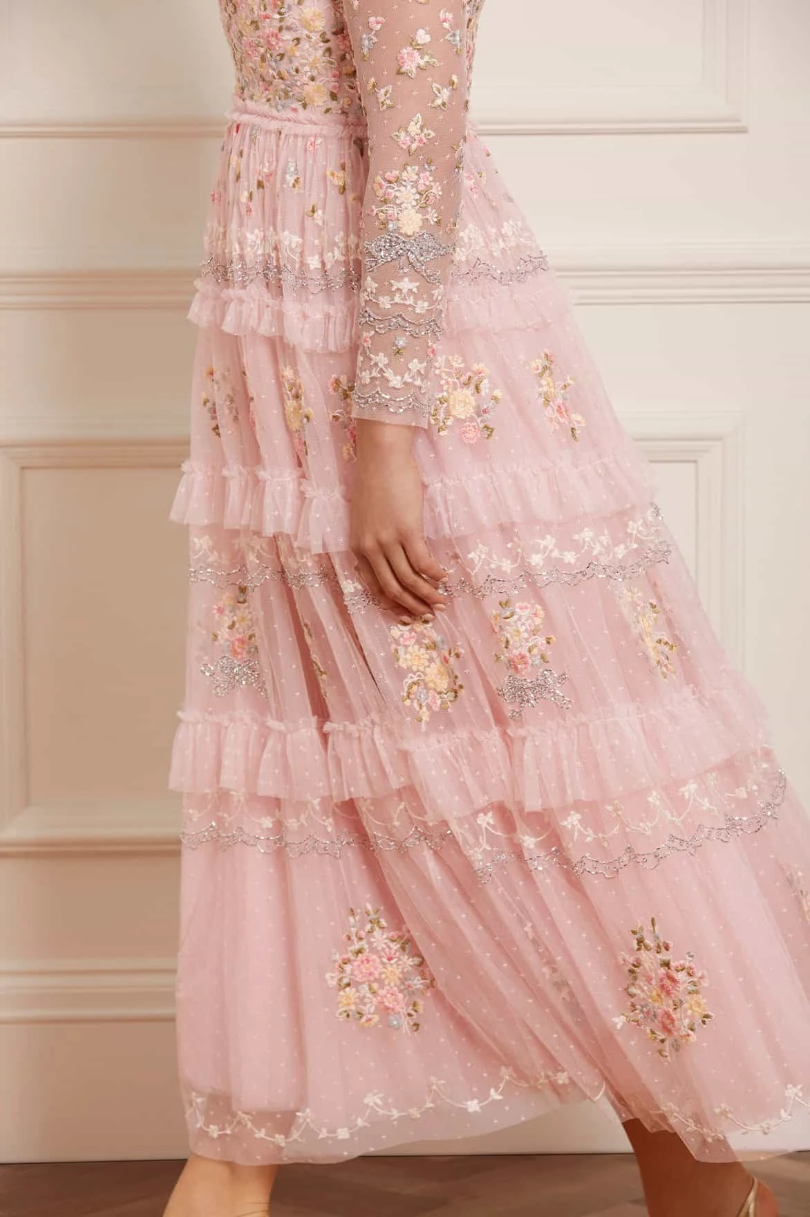 The Primrose Bouquet Long Sleeve Ankle Gown in Blush Pink. This gown is intricately designed with embroidery and beading work. Decorated with floral border motifs, inspired by beautiful bouquets. Designed with elaborate embellishment using silver cut beads and components to create highlights of shimmer. The silhouette of the dress has perfectly placed tulle frills and layers of net to create romantic volume. Make a statement in the Primrose Bouquet.