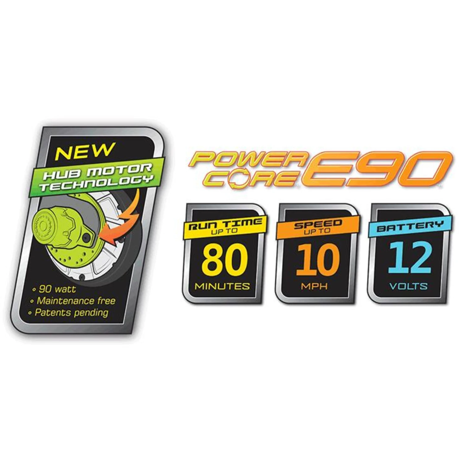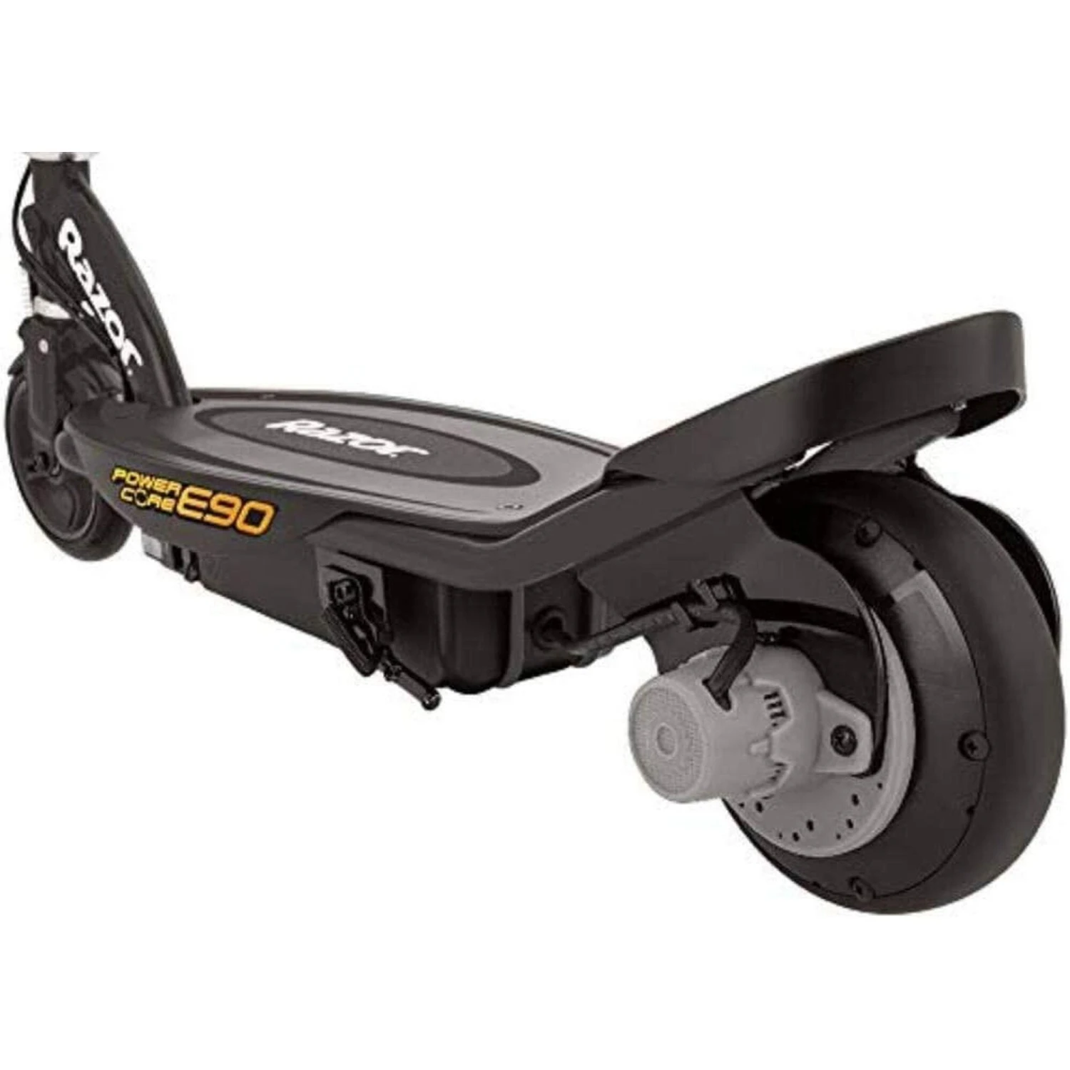 Power-up your Ride. The Razor Power Core E90 in black is upping the ante for electric scooters once again, rolling out an amazing 80 minutes of continuous ride time and fifty percent more muscle power. Its innovative hub motor delivers a more efficient, maintenance-free ride (no alignment, no chain, no belt), while the steel frame, lighter weight and increased torque take performance to the next level. With a max speed of up to 10 mph. It has a push-button accelerator, a hand operated front brake, a spoked, urethane front wheel with an abrasion-resistant, airless, flat-free tyre at the rear and it also has a retractable kickstand and comes with a 12 volt rechargeable battery and charger.