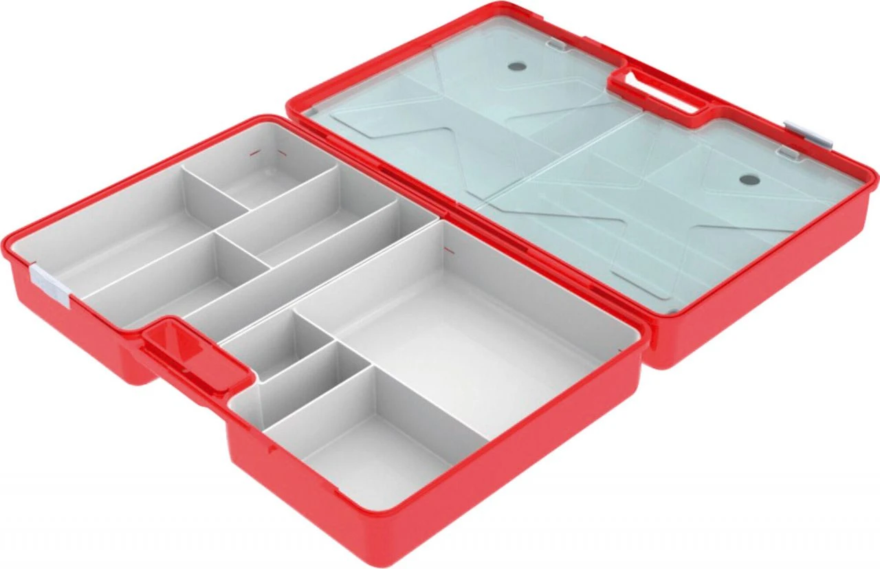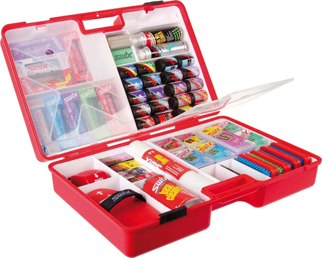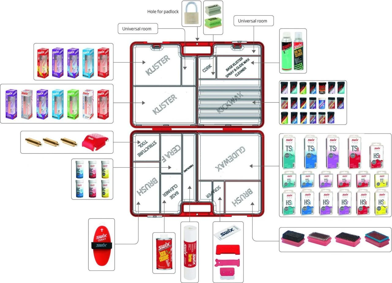 Practical, large wax box for cross-country skiing products. Dedicated compartments for grip waxes, klister, glide waxes, cleaner, brushes, scrapers, corks and structure tools. Supplied without content.
