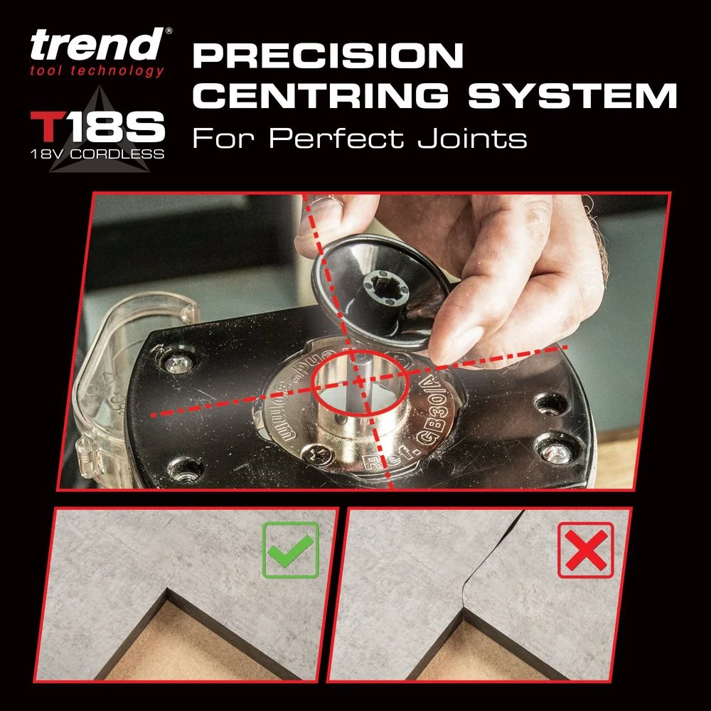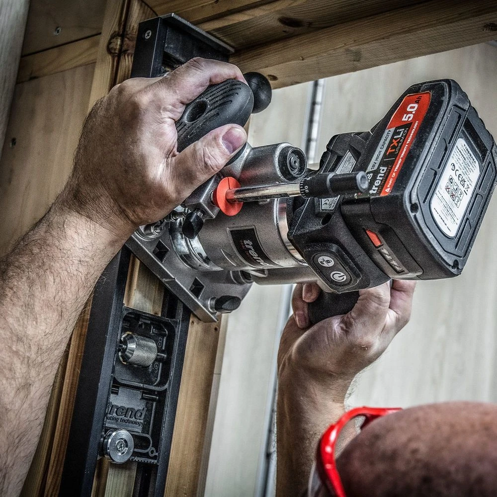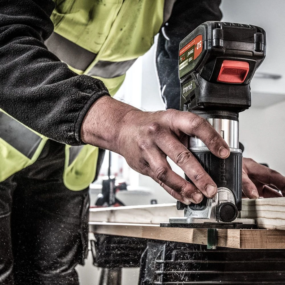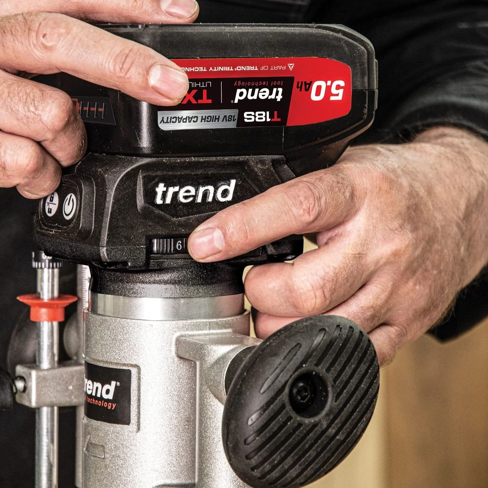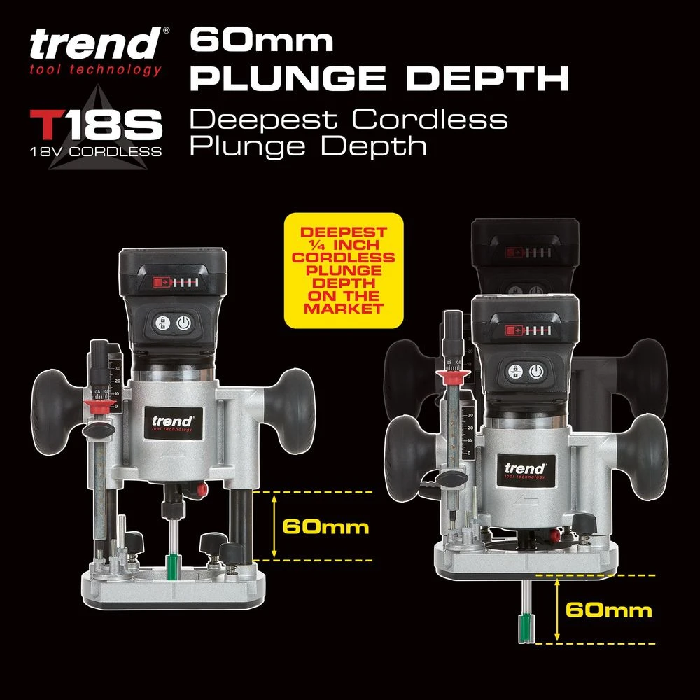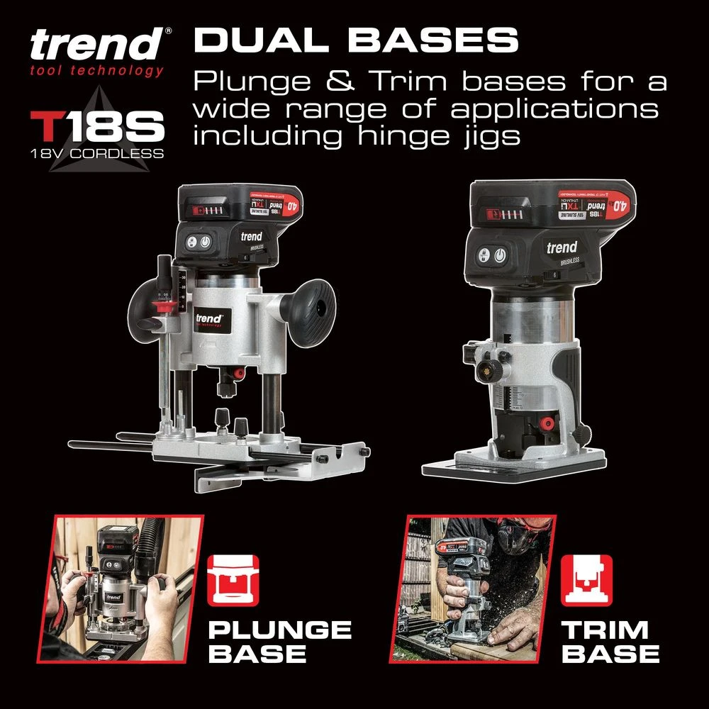 T18S 18V 1/4″ Brushless Router Kit (Bare Unit, Plunge & Trim Base) with Trend’s high performance brushless (BL) motor – Longer life, more power, better runtime.Designed to hold up against professional and trade use whilst maintaining accuracy and performance. With various methods of adjustment to allow versatility for a plethora of applications, as well as features, such as: quick-release plunge lock, extended trim base, twin LED lights, dust kit, safety on/off switch and a variable speed motor. Invest in kit that you can trust with Trend.